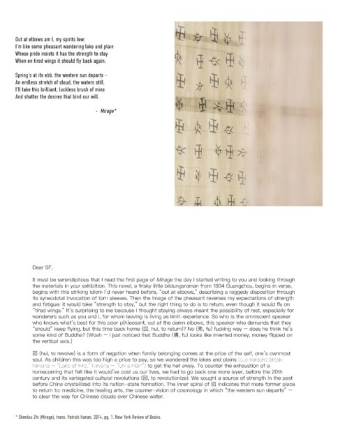 It must be serendipitous that I read the first page of Mirage the day I started writing to you and looking through the materials in your exhibition. This novel, a frisky little bildungsroman from 1804 Guangzhou, begins in verse, begins with this striking idiom I’d never heard before, “out at elbows,” describing a raggedy disposition through its synecdotal invocation of torn sleeves. Then the image of the pheasant reverses my expectations of strength and fatigue: it would take “strength to stay,” but the right thing to do is to return, even though it would fly on “tired wings.” It’s surprising to me because I thought staying always meant the possibility of rest, especially for wanderers such as you and I, for whom leaving is living as limit-experience. So who is the omniscient speaker who knows what’s best for this poor p(h)easant, out at the damn elbows, this speaker who demands that they “should” keep flying, but this time back home (回, hui, to return)? No (弗, fu) fucking way – does he think he’s some kind of Buddha? (Woah – I just noticed that Buddha (佛, fu) looks like inverted money, money flipped on the vertical axis.)