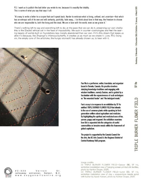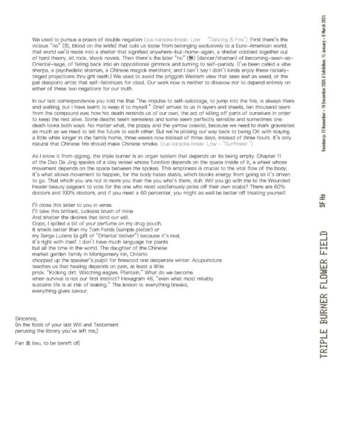 TRIPLE BURNER FLOWER FIELD is an exhibition by SF Ho that was on view at Oxygen Art Centre from January 15 – March 8, 2025. Read Fan’s text, Dear SF, here. Plain text version below.