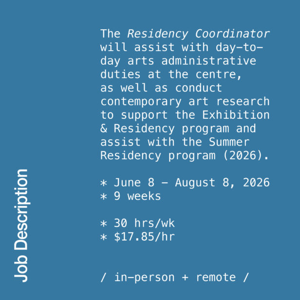 Reporting to Oxygen’s Executive Director, the Residency Coordinator (CSJ) will assist with day-to-day arts administrative duties with focus supporting the Summer 2026 Residency with textile artists Paige Gratland, Glenn Gear, and Daniel Barrow (July 1 – August 8, 2026), as well as conduct contemporary art research to support the Exhibition & Residency program and assist with the research and production of exhibition catalogues, exhibitions, residencies, and adjunct educational materials.