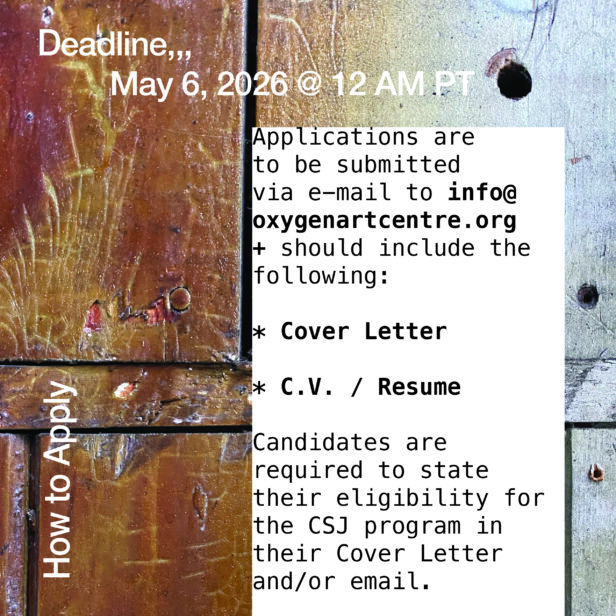Oxygen Art Centre will accept applications to the Residency Coordinator (CSJ) summer employment opportunity until Wednesday, May 6, 2026. Applications are to include a Cover Letter and Resume. Please review the qualifications and scope of the position on Oxygen’s website.