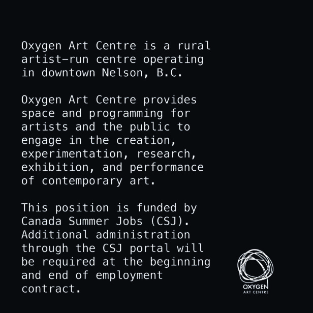 To apply, e-mail a Cover Letter and Resume to info@oxygenartcentre.org with the subject line: “ATTN: Residency Coordinator Application.” Please include confirmation of your Canada Summer Jobs (CSJ) eligibility in the Cover Letter and e-mail.