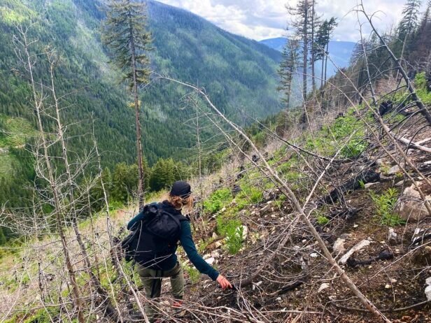 images: (left) slope study, charcoal, ash, soil, elderberry, tansey and fireweed ink on paper, 11×17, 2025. Materials collected at Duhamel Creek fire on unceded Sinixt territory; (right) Monument Creek Wildfire fieldwork, June 2024, Image credit: Emily Nilsen; (bottom) work in progress; All images courtesy the artist