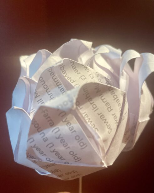 Image: Paper flower created from documented names of deceased children during the first six months of the genocide, Rayya Liebich, 2026; Courtesy the Artist