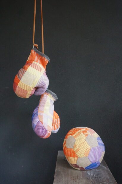 The boxing glove serves as a central form—both a symbol of conflict and a container for emotion. Constructed through the slow, deliberate process of hand weaving and textile assembly, the work holds a tension between method and feeling: a quiet, careful making that contrasts with an undercurrent of anger.