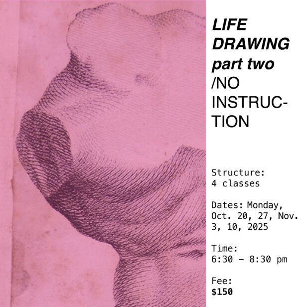 Drawing sessions will provide the opportunity to draw from a professional model. No formal instruction is offered. Classes are structured in a standard life drawing format of short gestural poses followed by poses of increasing length, from 5-20 minutes. Students are expected to provide the drawing materials of their choice.