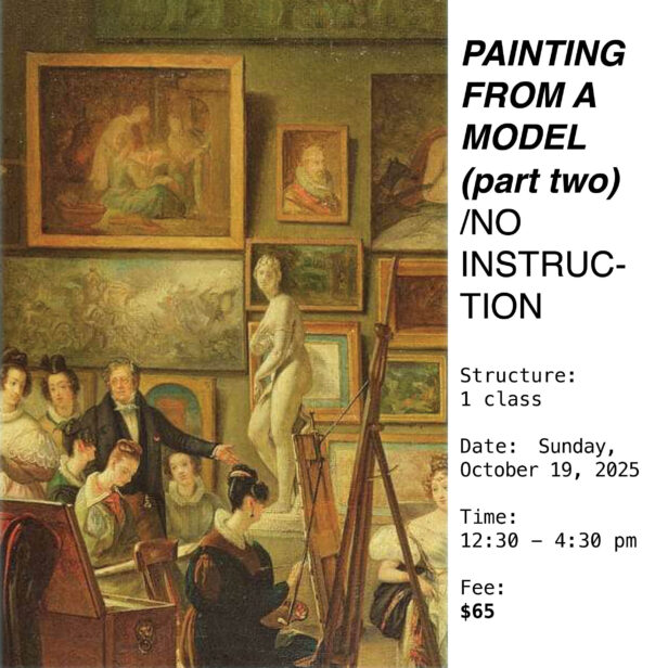 Participants will have the opportunity to work from a model holding a single pose for an extended session (3.5 hours). No formal instruction is offered. Participants will be asked to bring their own materials in their preferred medium.