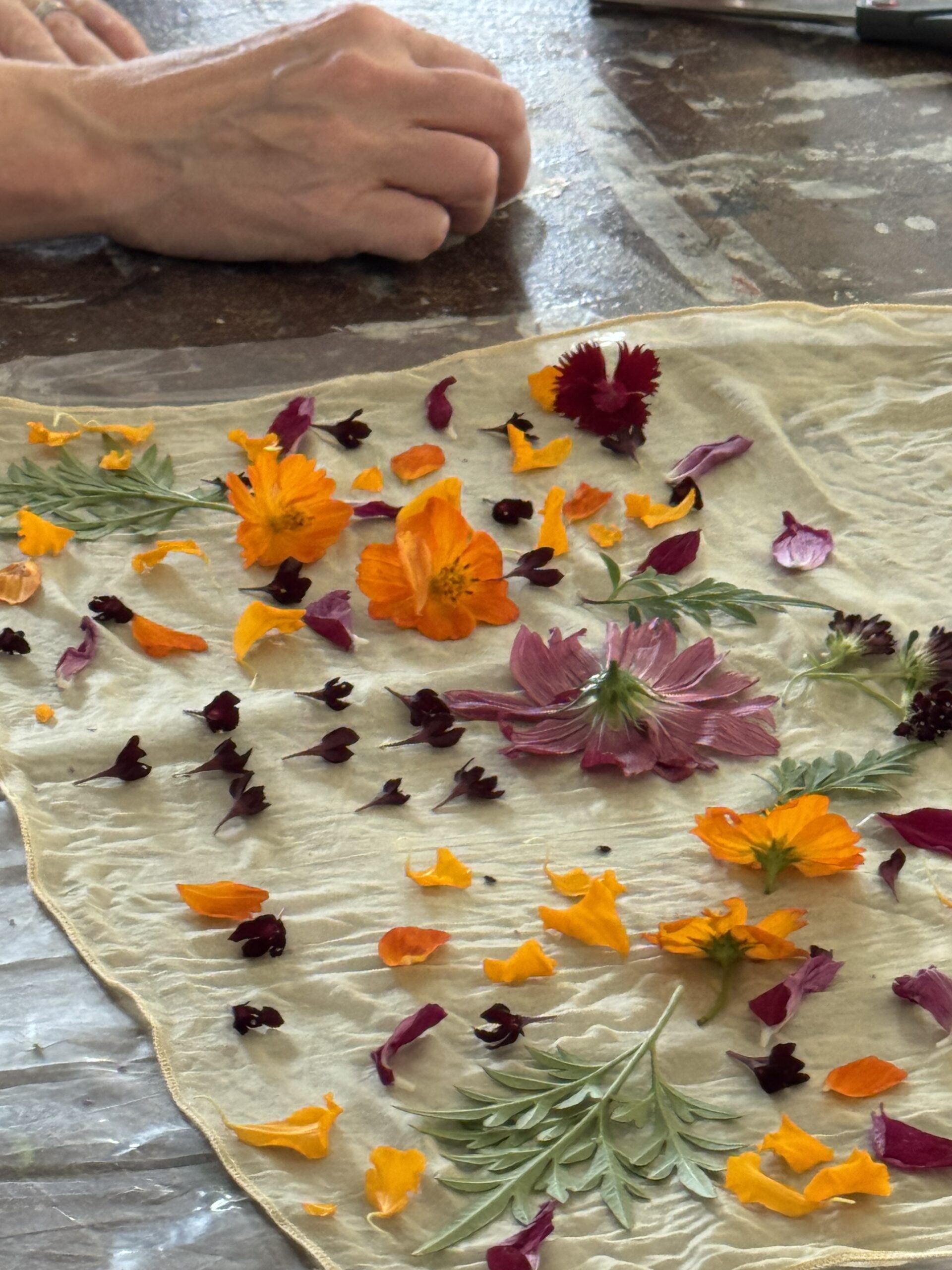 Using locally grown flowers, that have been thoughtfully dried and pressed, each participant will have the opportunity to design and create their own botanically printed cotton bandana to take home.